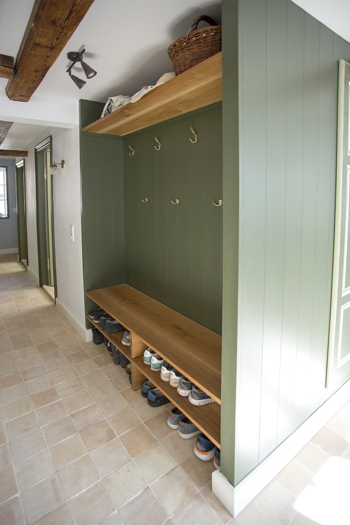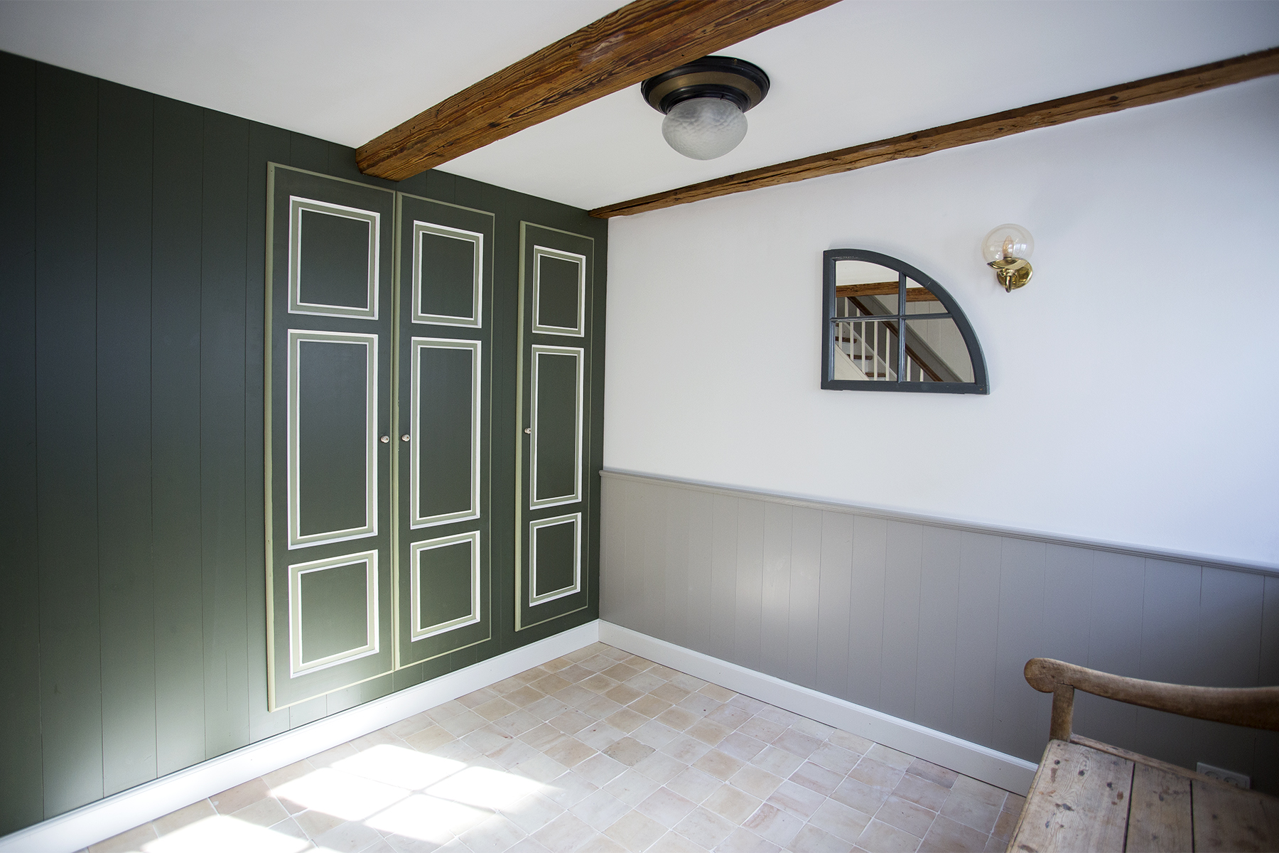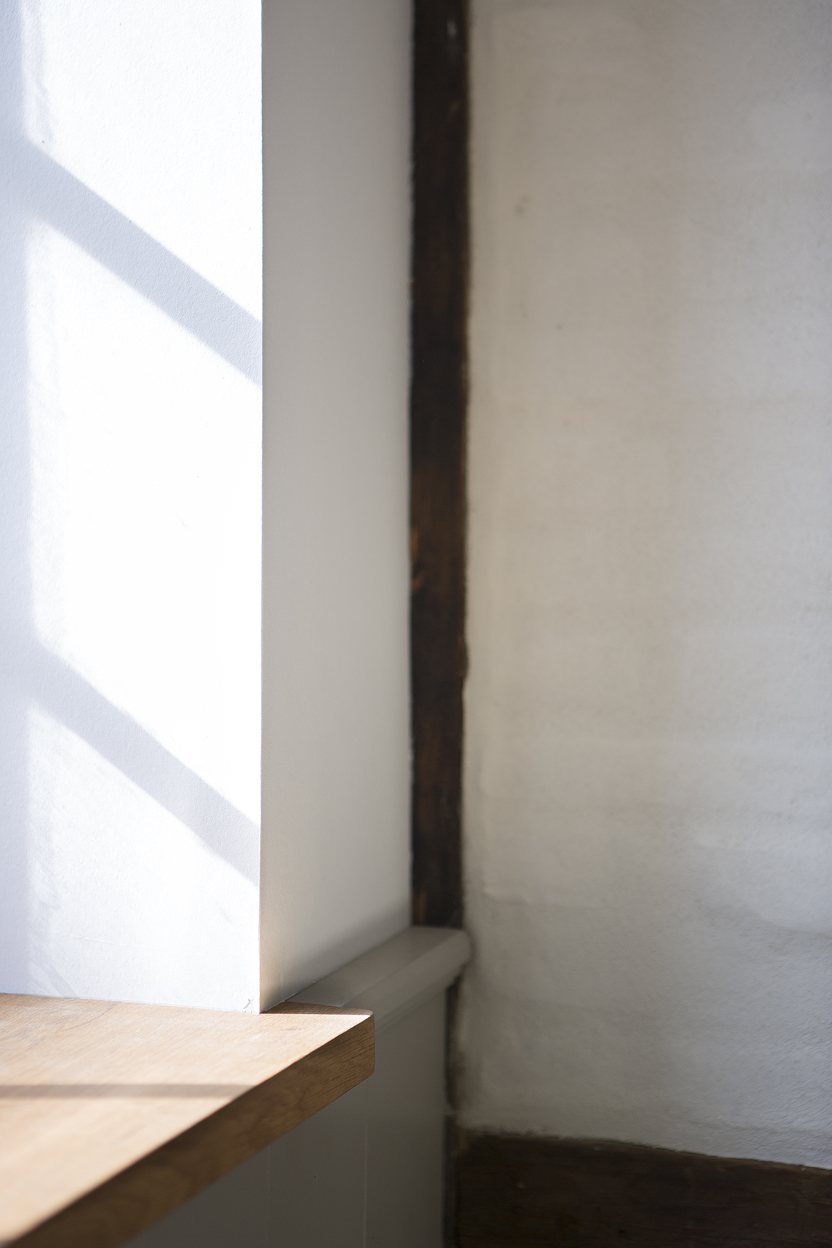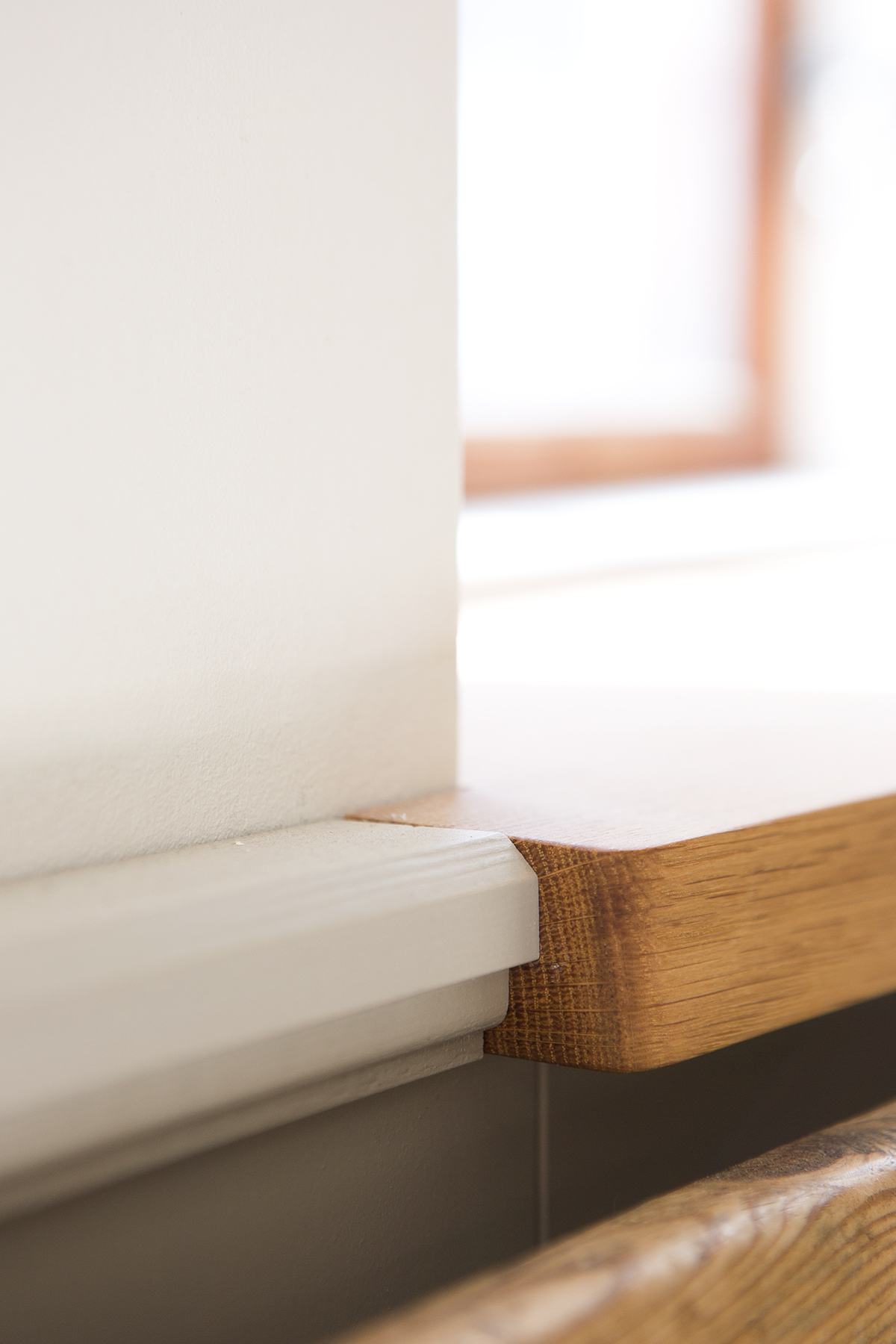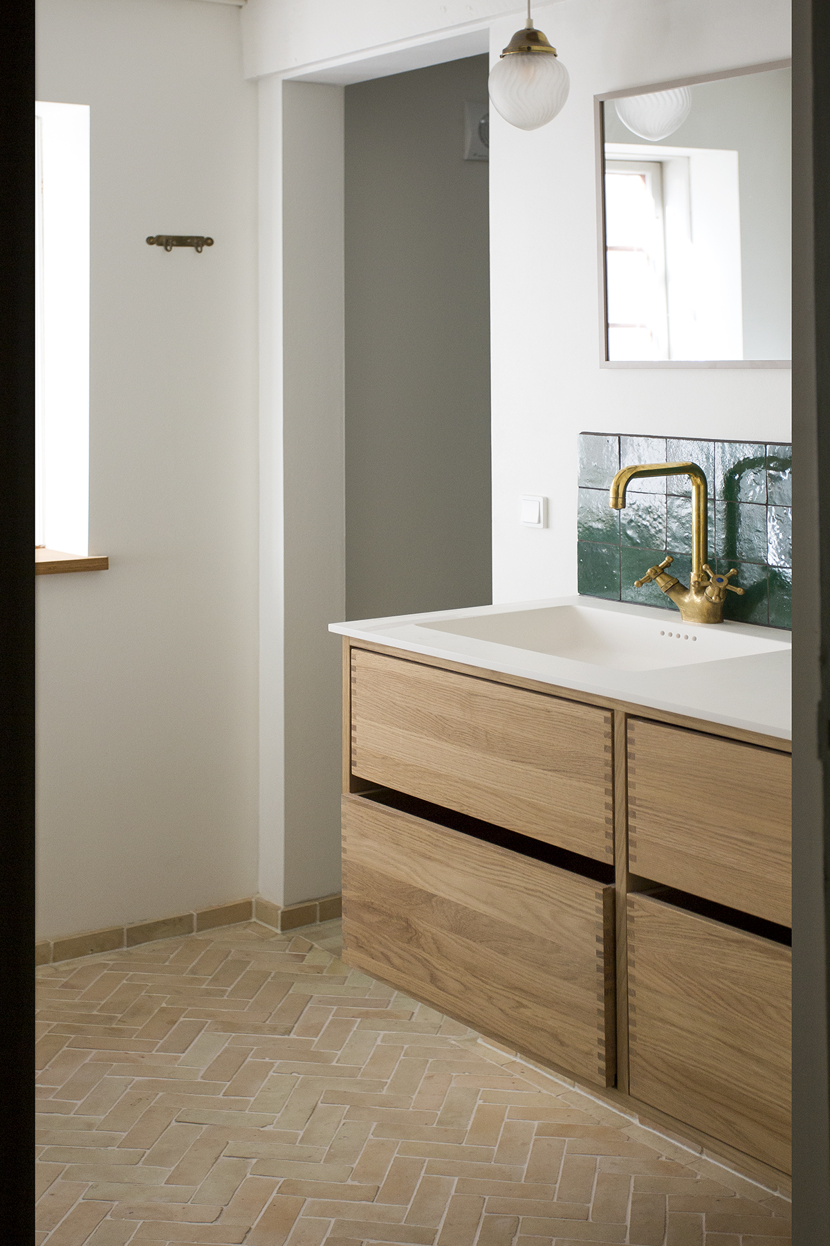 Planløsningen blev tilpasset med nye dør- og vinduesåbninger samt helt nye el- og VVS-installationer, herunder installation af fjernvarmeunit og gulvvarme i fire zoner. Badeværelse og bryggers blev opført i klassiske materialer med smukke flise- og armaturløsninger. Alt er udført med respekt for husets sjæl og historiske detaljer.